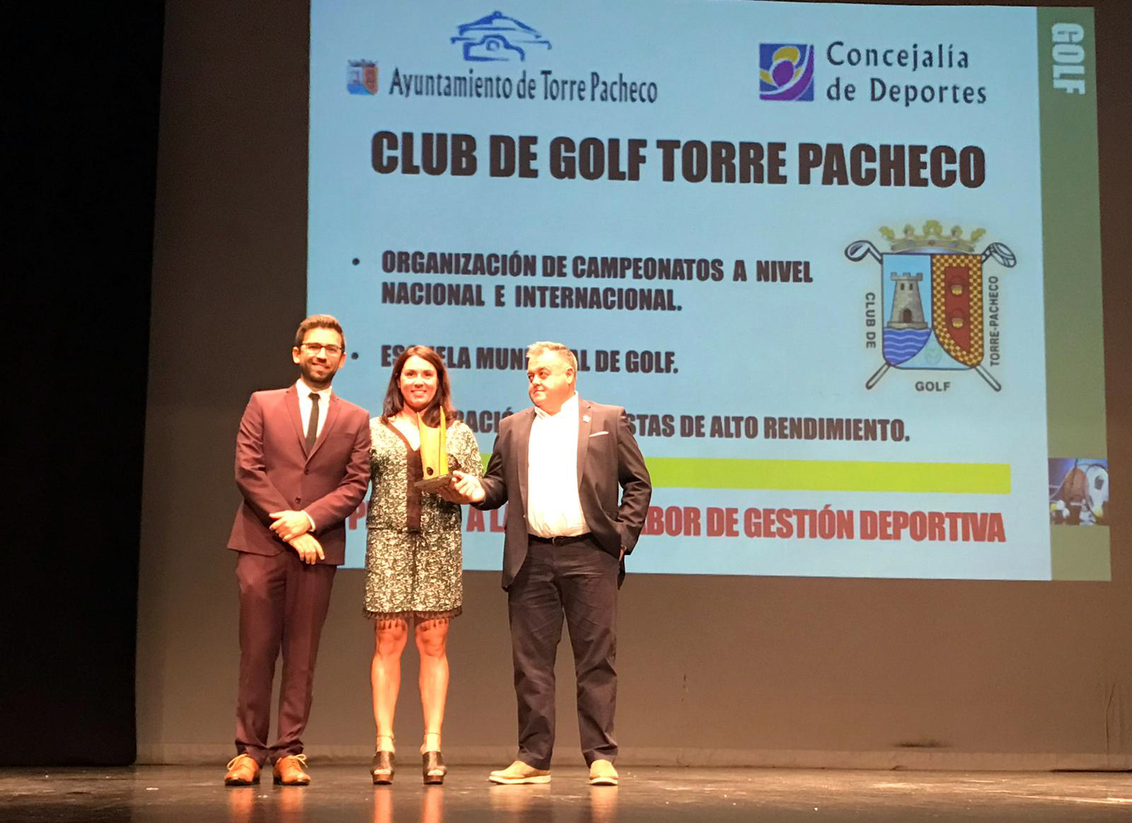 Durante la gala de los Premios al Mérito Deportivo 2017, organizados por el Ayuntamiento de Torre Pacheco y celebrados el 28 de septiembre, el Club de Golf de la localidad murciana fue distinguido con el premio a la ‘Mejor labor de Gestión Deportiva’. El premio lo recogió el presidente del club pachequero, Juan Salvador Soto, quien tuvo palabras de agradecimiento para todos sus predecesores y juntas directivas anteriores. La mención especial a título póstumo otorgada por el Consistorio fue para quien fuera precisamente el antecesor en el cargo del actual presidente del club de golf pachequero, Rafael Baeza. Soto estuvo acompañado por miembros de su junta y por su gerente, Maribel Romero.